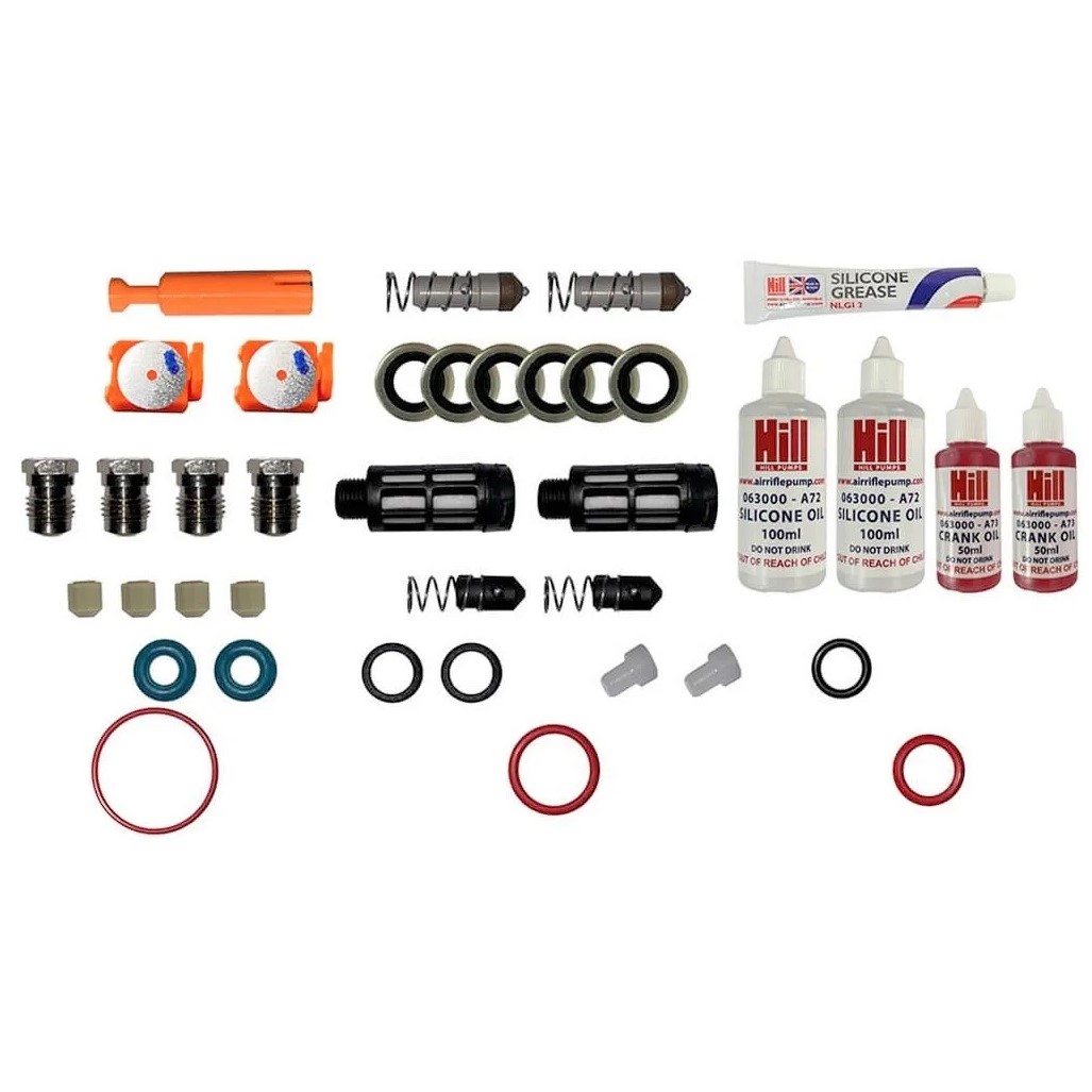 Complete onderhoudskit voor Hill EC-3000 en Evo compressors met originele onderdelen voor vier servicebeurten. Bevat alle essentiële zuigerafdichtingen, breekplaten, oliën en filtercomponenten voor de eerste 100 gebruiksuren. Inclusief professioneel klepgereedschap voor eenvoudig onderhoud van je luchtbuks vulstation.