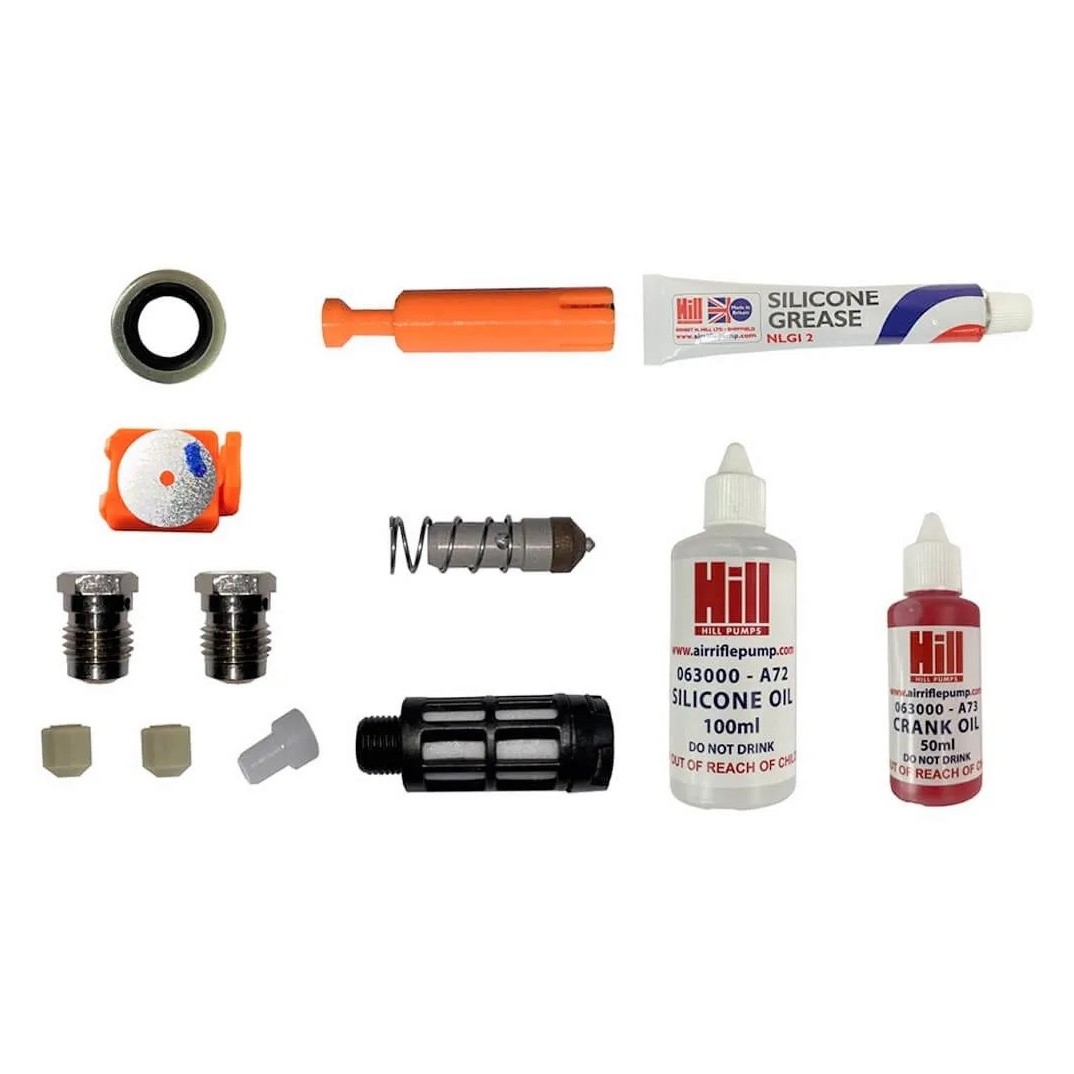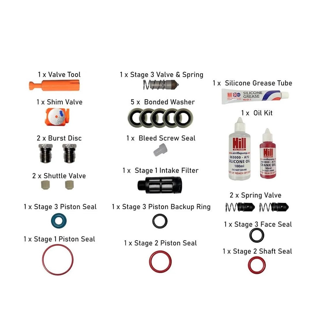 Deze professionele onderhoudskit voor Hill EC-3000 en Evo compressoren bevat alle essentiële onderdelen voor een complete 50-uurs servicebeurt. De kit omvat premium onderdelen zoals siliconengel, crank olie en specialistische afdichtingen, plus handig klepgereedschap voor eenvoudig luchtbuks onderhoud.